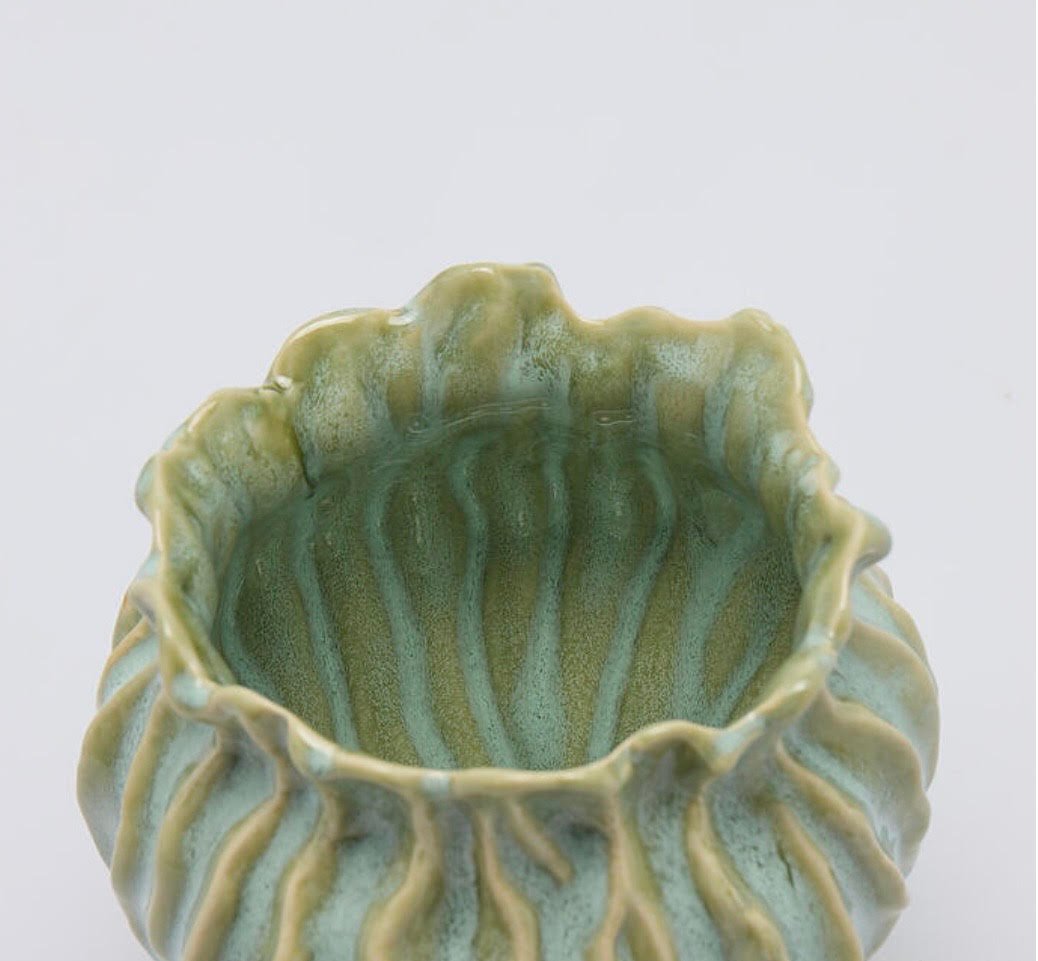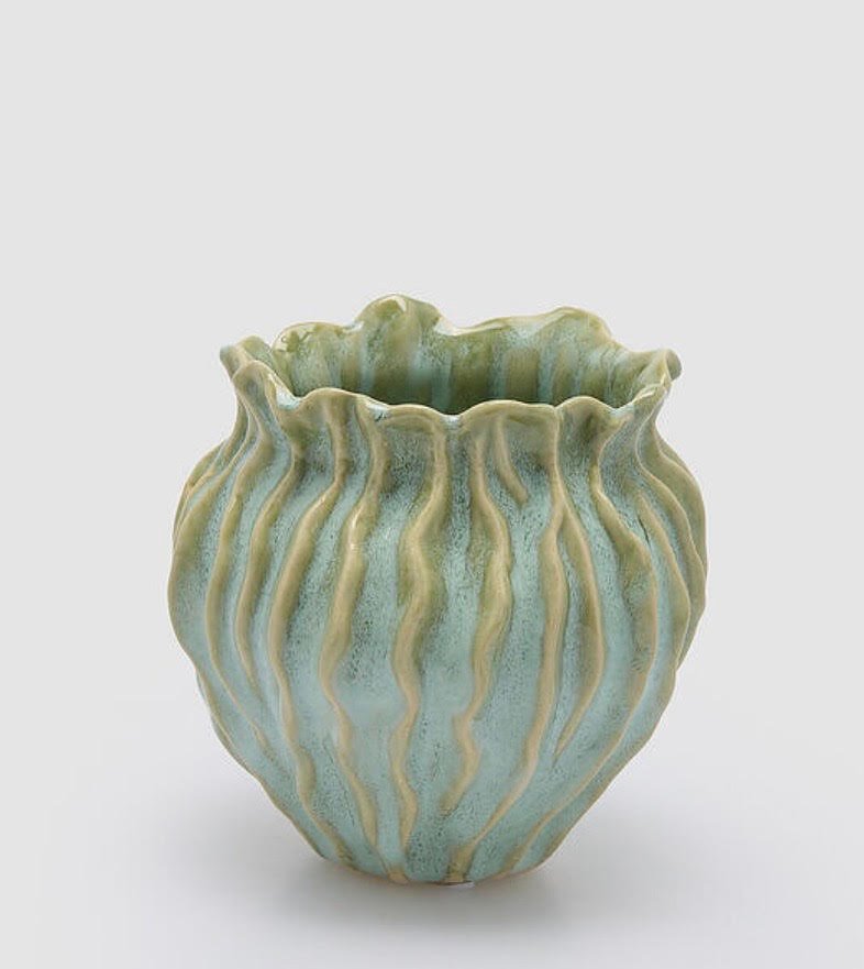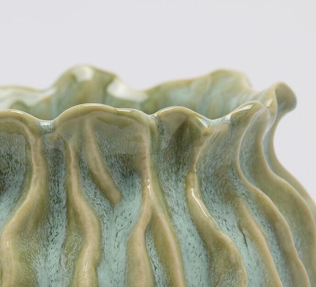 Jarrón de cerámica rizado vidriado verde desgastado. Mide 18 cm de alto y 18,5 cm de diámetro.
