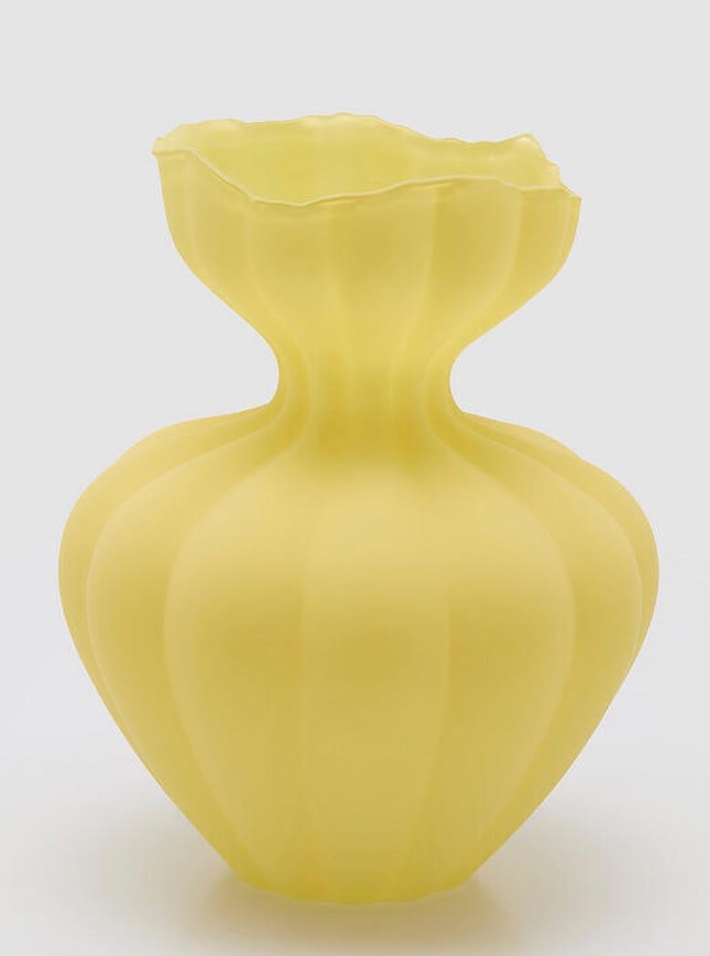 Jarrón curvas amarillo satinado de cristal. Mide 32 cm de alto y 26 cm de diámetro. Viene con caja de regalo.