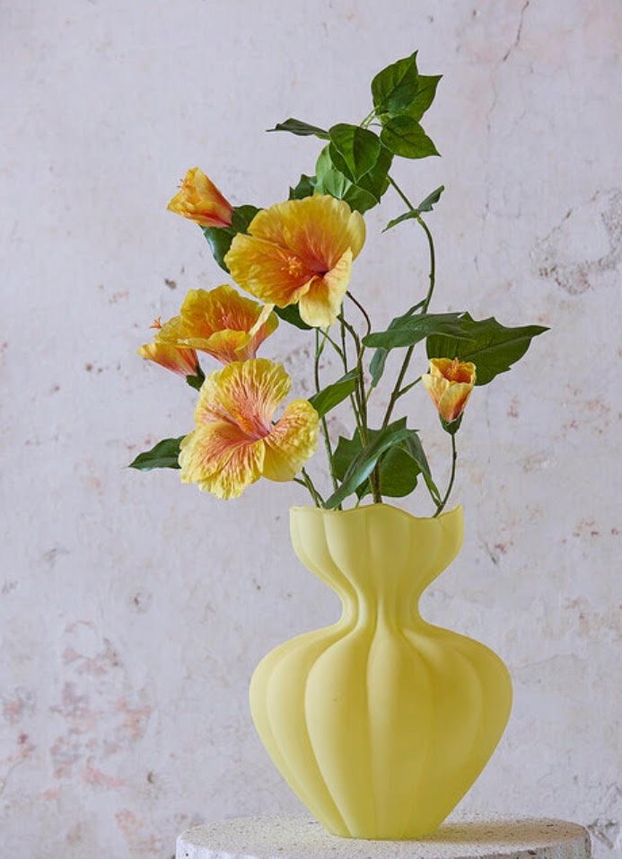 Su acabado en color amarillo satinado aporta luminosidad y estilo, siendo una opción muy utilizada en proyectos de interiorismo en Huelva para decorar mesas, estanterías o composiciones florales. Además, incluye caja de regalo, lo que lo convierte también en una excelente opción para obsequiar.