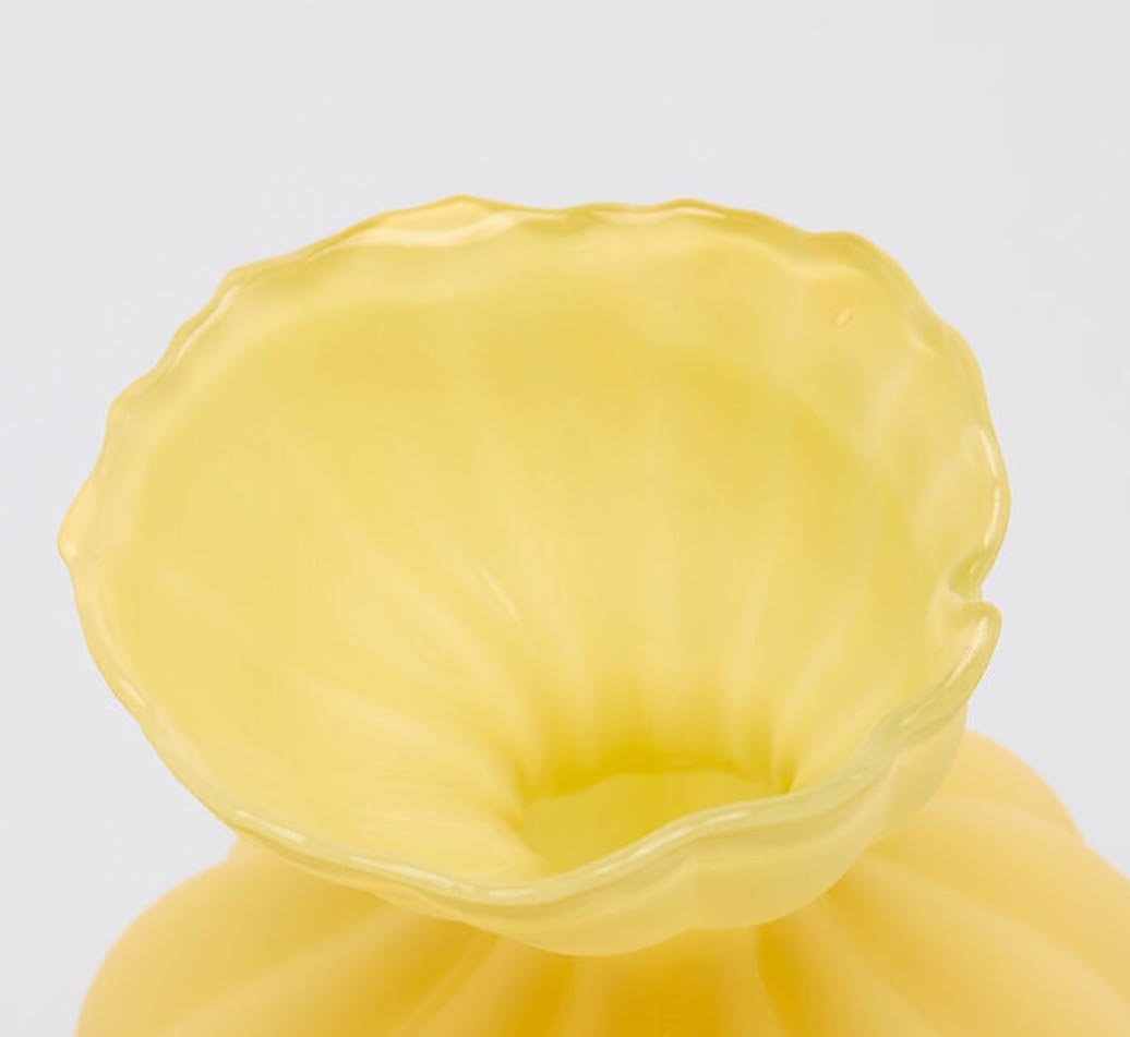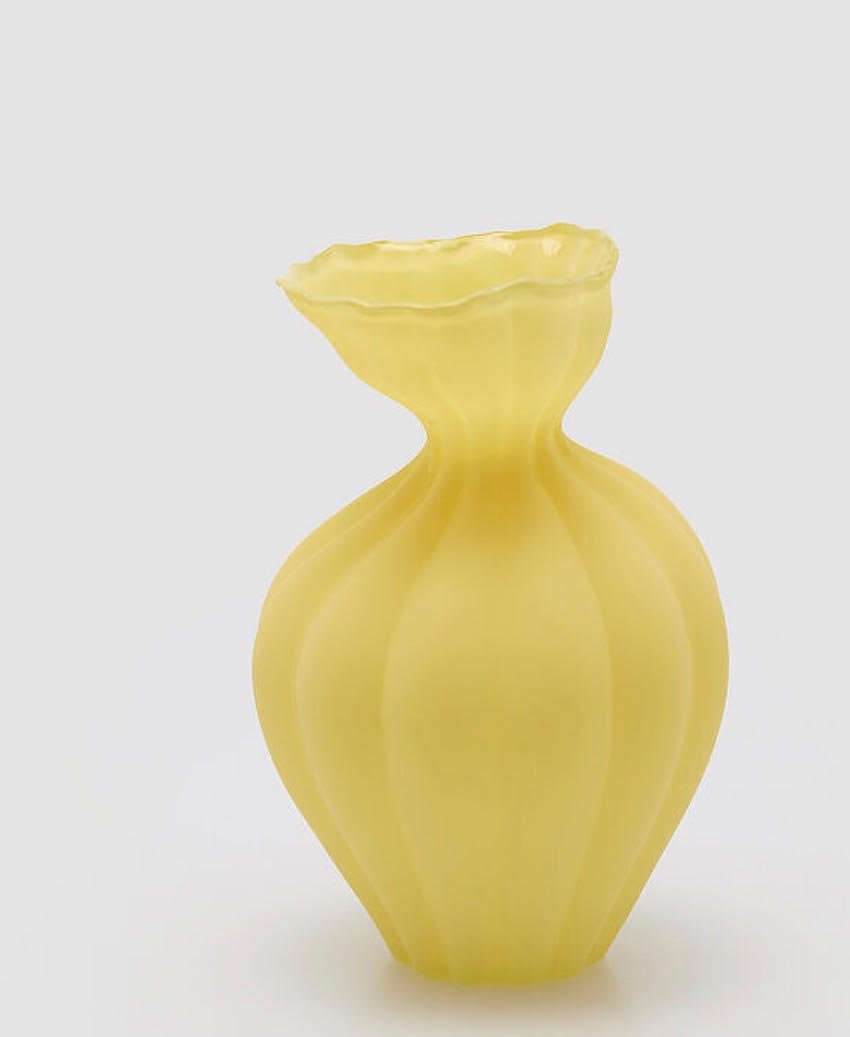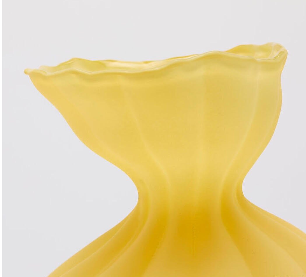 Jarrón curvas amarillo satinado de cristal. Mide 30,5 cm de alto y 19,5 cm de diámetro. Viene con caja de regalo.